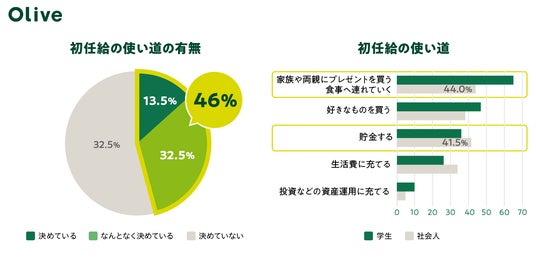 また社会人にとって特別なことの一つである「初任給」について、学生に対して既に使い道を決めているかを聞いたところ、「決めている(13.5%)」「なんとなく決めている(32.5%)」と回答し、全体の半数近くにあたる約46.0%の方が入社の半年前から初任給の使い道を決めていることが判明しました。