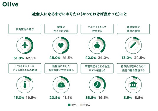 一方で、新社会人が社会人になるまでにやっておけば良かったこと(やっておいて良かったこと)TOP3は、「長期旅行や遊び(42.5%)」、「家族や友人との交流(41.5%)」、「語学留学や語学の勉強(24.5%)」となり、学生、新社会人ともに、時間を自由に使える学生時代だからこそ出来ることへの優先度が高いことが明らかになりました。