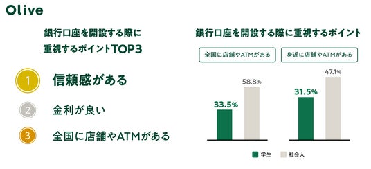 また、学生は「全国に店舗やATMがある(58.8%)」、「身近に店舗やATMがある(47.1%)」ことを重視していることに対し、新社会人は「全国に店舗やATMがある(33.5%)」、「身近に店舗やATMがある(31.5%)」と数値が下がる結果に。地元以外の土地で生活する機会の増加や仕事などで時間が限られる中で、店舗に行かなくても完結する銀行サービスを利用しているのかもしれません。