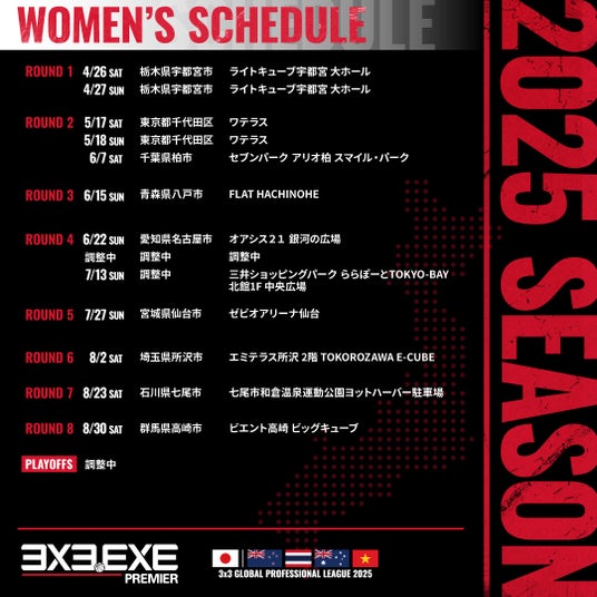 【3×3.EXE PREMIER JAPAN 2025 SEASON】女子開幕戦が4/26-27(ライトキューブ宇都宮)、男子開幕戦が5/17-18(ワテラス)に決定!!!