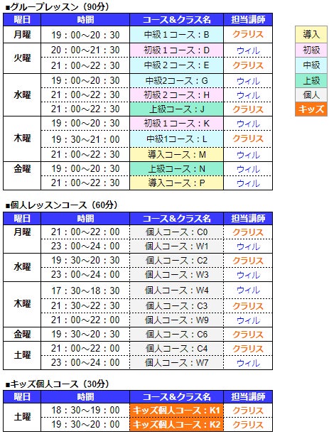 *レッスンは週1回。時間はいずれも日本時間。