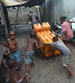 不法居住地区アボキコジで危険なガソリンタンクを運ぶ子どもたち。砂地のためリヤカーを動かすのは大人でも重労働