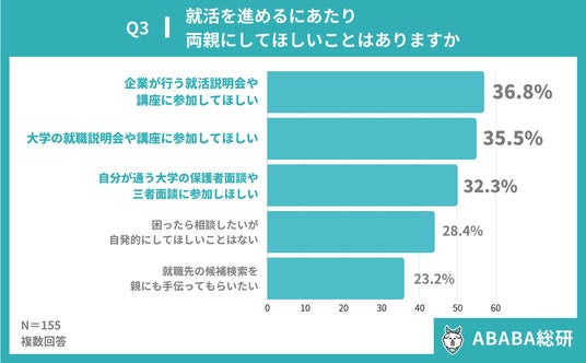 Q.1で「就活状況について把握しておいてほしいし、サポートしてほしい。」と回答した子世代に親に協力してほしい内容を尋ねたところ、「企業が行う就活説明会や講座に参加してほしい」(36.8%)という回答が最も多く、次いで「大学の就職説明会や講座に参加してほしい」(35.5%)、「自身が通う大学の保護者面談や三者面談に参加してほしい」(32.3%)と続きました。また、最も少ない回答ではあるものの「就職先の候補検索を親にも手伝ってもらいたい」(23.2%)と、2割以上の子どもが考えていることがわかりました。自身の就職活動に親にも本格的に参加してもらい、就職先の選定を失敗したくないという想いが見受けられます。