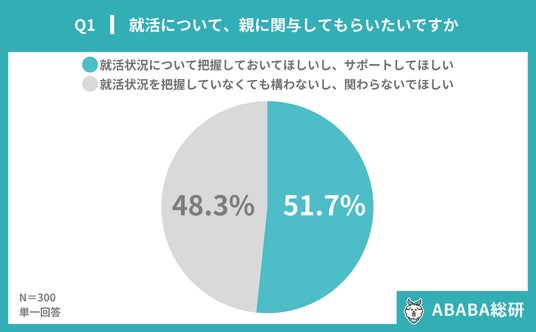 子世代の対象者全員に親の関与についての希望を尋ねたところ、「就活状況について把握しておいてほしいし、サポートしてほしい。」(51.7%)と半数以上が答えており、就職活動には親のサポートが必要と考える子世代が多いことがわかります。一方で、もう半数近い48.3%の子世代が「親は就活には関わらないでほしい」という回答で、自分の力で就職活動を行いたいという意識を持つ子世代も多く見られました。