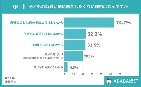 Q.1で「関与せず、子どもの意思に任せたい」と回答した親にその理由を尋ねたところ、「自分のことは自分で決めてほしいから」(74.7%)という回答が最も多く7割以上を占め、次いで「子どもに自立してほしいから」(32.2%)が続き、子どもに自立した一人前の社会人になってほしいと願っていることがうかがえます。