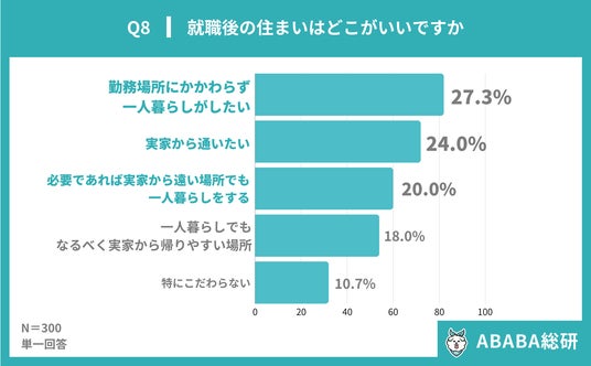 対象の子世代全員に就職後の住まいについて尋ねたところ、「勤務場所に関わらず一人暮らしがしたい」(27.3%)が最も多く、次いで「実家から通いたい」(24.0%)という結果でした。