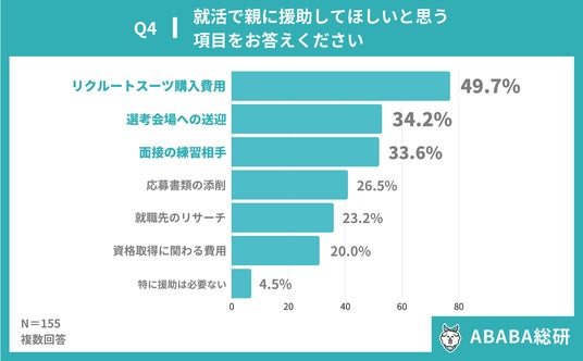 Q.1で「就活状況について把握しておいてほしいし、サポートしてほしい。」と回答した子世代に援助してほしいことを尋ねたところ、「リクルートスーツ購入費用」(49.7%)が最も多い回答でしたが、他にも「選考会場への送迎」(34.2%)や「資格取得に関わる費用」(20.0%)など費用面や移動のサポートを望む回答が見られました。一方で、「面接の練習相手」(33.6%)、「応募書類の添削」(26.5%)、「就職先のリサーチ」(23.2%)という、就職活動への直接的なサポートを望む意見も見られました。