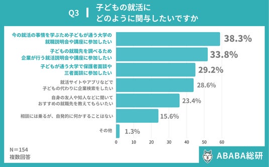 Q.1で「関与したい。就活状況を把握したいし、サポートしたい」と回答した親世代に関与したい内容を尋ねたところ、「今の就活の事情を学ぶため、子どもが通う大学の就職説明会や講座に参加したい」(38.3%)が最も多く、次いで「子どもの就職先を調べるため、企業が行う就活説明会や講座に参加したい」(33.8%)、「子どもが通う大学で保護者面談や三者面談に参加したい」と続きました。子どもの就職活動を成功させるために、積極的にサポートをするという姿勢がうかがえました。