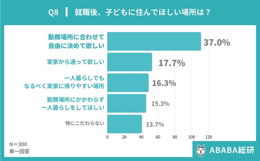 対象の親世代全員に子どもの就職後の住まいについて尋ねたところ、「勤務場所に合わせて自由に決めてほしい」(37.0%)という回答が最も多く、第2位から20ポイント近い差をつけました。