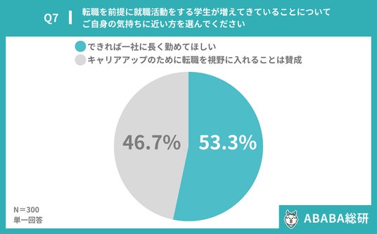 対象の親世代全員に子どもの転職への意識を尋ねたところ、「できれば一社に長く勤めてほしい」(53.3%)、「キャリアアップのため転職を視野に入れることは賛成」(46.7%)という結果でした。