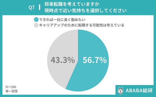 子世代の対象者全員に転職への意識を尋ねたところ、「できれば一社に長く勤めたい」(56.7%)、「キャリアアップのために転職する可能性は考えている」(43.3%)という結果でした。