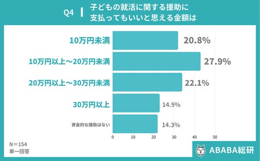 Q.1で「関与したい。就活状況を把握したいし、サポートしたい」と回答した親世代に就活を援助するために支払える金額を尋ねたところ、「10万円以上~20万円未満」(27.9%)という回答が最も多く、次いで「20万円以上~30万円未満」(22.1%)、「10万円未満」(20.8%)、「30万円以上」(14.9%)と続きました。また、「資金的な援助はない」(14.3%)という回答は最も少ない結果になりました。