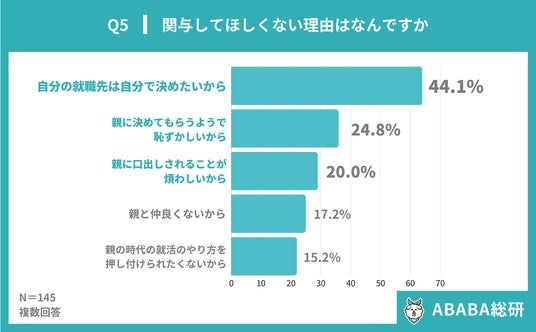 Q.1で「就活状況を把握していなくても構わないし、関わらないでほしい。」と回答した子世代にその理由を尋ねたところ、「自分の就職先は自分で決めたいから」(44.1%)と半数近い子世代が回答し、次に「親に決めてもらうようで恥ずかしいから」(24.8%)という回答が続き、多くの子世代が自身の力で就職を決めたいという意識の高さが見受けられました。