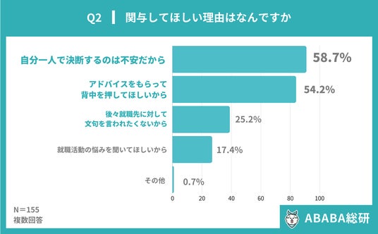 Q.1で「就活状況について把握しておいてほしいし、サポートしてほしい。」と回答した子世代にその理由を尋ねたところ、「自分一人で決断するのは不安」(58.7%)という回答が最も多く、次いで「アドバイスをもらって背中を押してほしい」(54.2%)という結果になりました。自分の力だけで就職活動を行うには心細いと感じる子世代が多いことが予想できます。