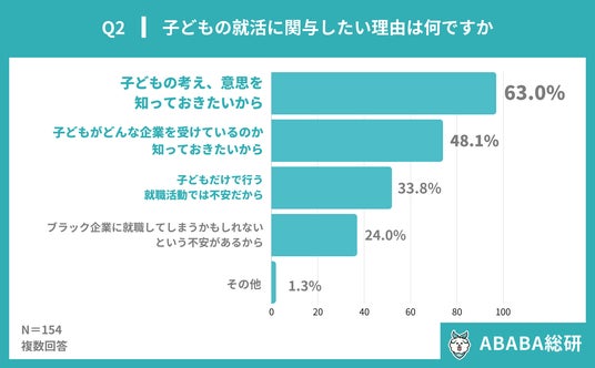 Q.1で「関与したい。就活状況を把握したいし、サポートしたい」と回答した親世代にその理由を尋ねたところ、「子どもの考え、意思を知っておきたいから」(63.0%)が最も多く、次いで「子どもがどんな企業を受けているのか知っておきたいから」(48.1%)という結果になりました。親の心情として子どもの気持ちや行動を知っておきたいという回答が多い傾向が見受けられました。
