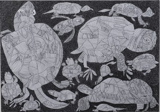 1973生まれ 滋賀県在住 2008年から『やまなみ工房』に在籍 ペンを用いて人物や動物等、モチーフが決まると彼独自の視点で余白を余すことなく、紙面全てにゆっくりと描きこんでいく。彼の内向的で真面目な性格が作品にも反映され描く線の一つひとつがとても丁寧で、まるで細い糸が絡み合っているかのように繊細に描かれる。日常では、ほとんど言葉も発することなく意見を求めても、顔を赤らめながら、か細い声で一言口にする程度しかない彼の作品からは、内に秘めた思い全てが放出され、訴えかける力強さに満ち溢れている。彼もまた自己を表現する術を作品制作に見出した1人であり、これからも彼の世界観は大きく広がっていくだろう。