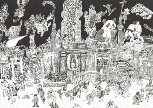 2002年生まれ、滋賀県在住。2023年から「やまなみ工房」に所属。大好きなアニメやゲームのキャラクターを模写する事から絵を描く楽しみを持った少年期から、彼の世界観は更なる広がりを見せるようになった。細やかで緻密な線の集合体で描かれた動物や風景、妖怪やモンスターのような生き物が楽し気に生活される街並み等、彼の頭の中のイメージそのままが絵に映し出されている。絵を描く事で人とつながりが生まれ、夢を実現させるための活力であると、彼の創作への意欲は絶える事はない。