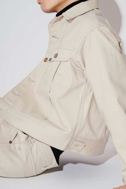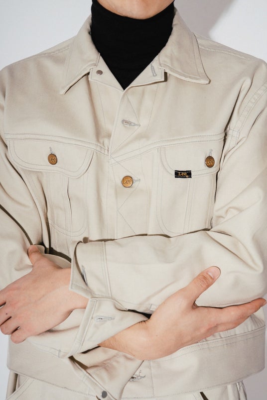 採用されている記事は、Leeが自社で生産した日本製のコットン。常に作られるわけではなく、Leeの100周年を契機にアーカイブの素材を研究して、新たに開発・生産された。生成りがかったカラーはヴィンテージを忠実に再現していて、2016年にレショップが手がけた別注とわずかに色合いが異なる。