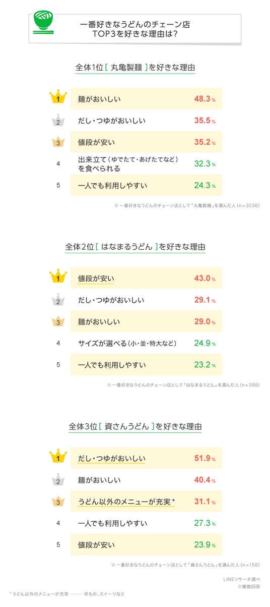 「LINEリサーチ」では、全国の10~60代の男女を対象に、一番好きなうどんのチェーン店と、そのお店を好きな理由について調査しましたので、結果をお知らせします。