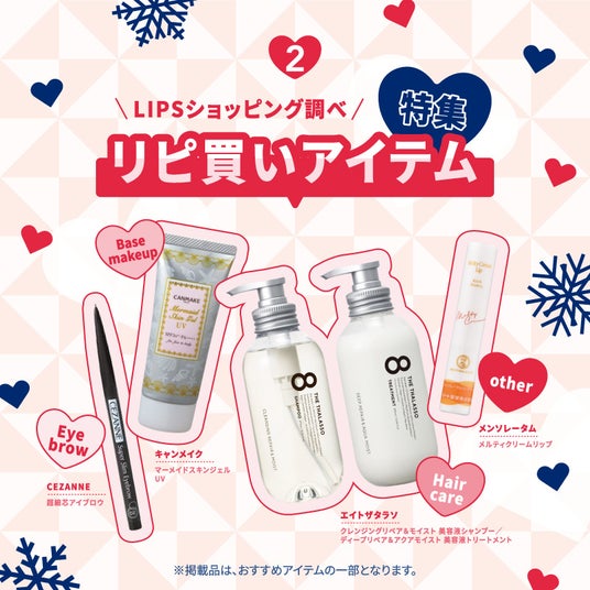 「LIPSフェスタ 2025 Winter」でぜひおすすめしたいアイテムをまとめた「リピ買いアイテム特集」「肌荒れ予防アイテム」といったふたつのセクションを設けています。この機会にクーポンを利用してお得にGETしてみてくださいね。