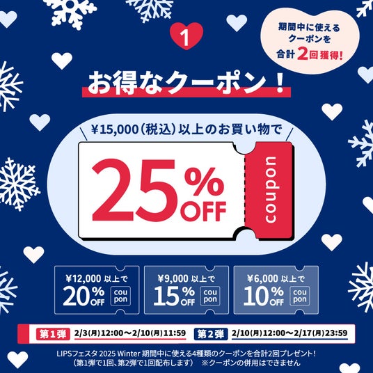 2025年2月3日(月)12:00から開始の「LIPSフェスタ 2025 Winter」では、4種類のお得なクーポンをLIPSアカウントをお持ちの方全員に配布しています。また、注目アイテムのサンプルを購入者限定で配布するなど、ご愛顧いただく多くの方に喜んでいただける企画をご用意。
