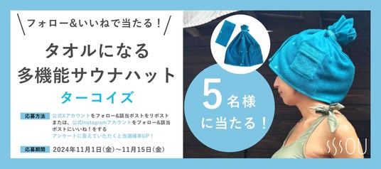 公式Xアカウントと公式Instagramアカウントをフォロー&キャンペーン投稿をリポスト+アンケート回答いただいた方の中から抽選で5名の方にサウナハット(ターコイズ)をプレゼントします。