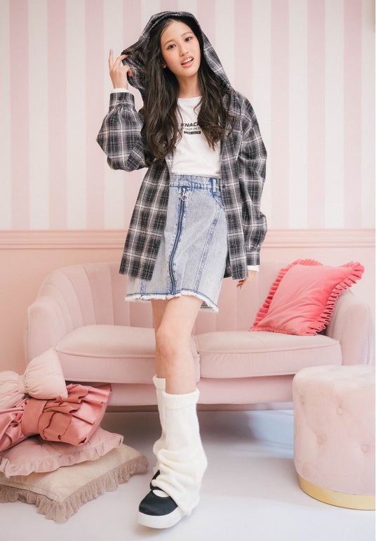 どこかあどけない可愛さと大人っぽさのバランスが取れたスタイルを着こなすルックでは、ミルキーな水色のスタジャンとエッジの効いたカーゴパンツ、大人っぽいデニムビスチェのセットアップやシャツフーディーのセットと台形のリングジップスカートなど、学校やお出かけに大活躍のアイテムを多数ご紹介しています。