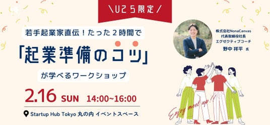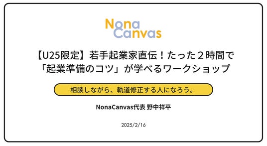 エグゼクティブコーチング事業を行う株式会社NonaCanvas(本社:東京都千代田区/代表取締役社長:野中 祥平)は、2025年2月16日(日)に開催されるU25(25歳以下)の方向け起業支援イベント「若手起業家直伝!たった2時間で『起業準備のコツ』が学べるワークショップ」に登壇いたします。