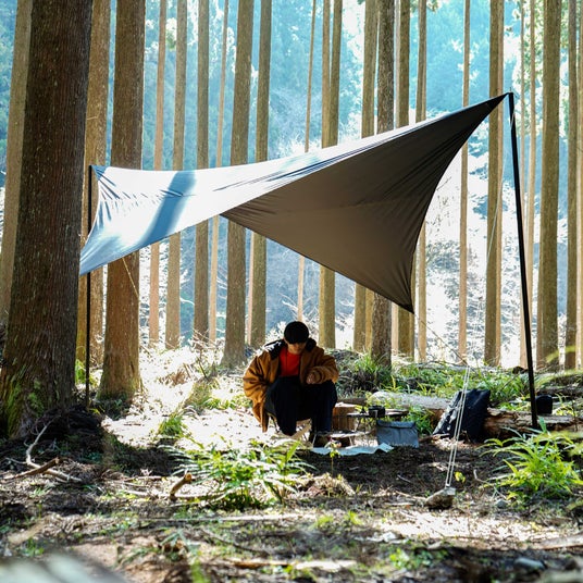 ソロ、2人~3人のキャンプからデイキャンプにおすすめなウイングタープ、テントに連結させるなど、おしゃれなキャンプサイトへと自由にレイアウトできます。タープ本体重量は約1000gと軽量で、収納サイズは280×350mm。バックパックに入れられて、持ち運びにも便利です。