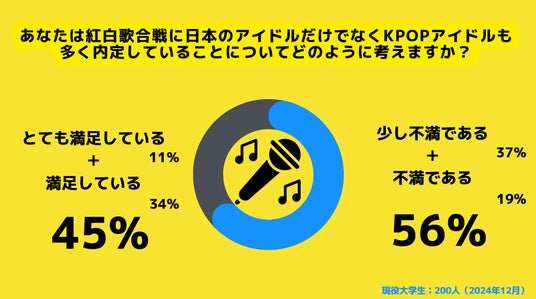 KPOPアイドルの紅白出演に不満であると回答した人は56%、中でも少し不満であると回答した人は、37%、不満であると回答した人は19%でした。