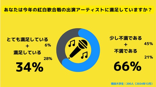 現役大学生の66%が今年の紅白出演アーティストに不満を感じていると回答しました。中でも少し不満であると回答した人は45%、不満であると回答した人は21%。