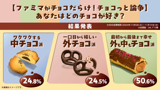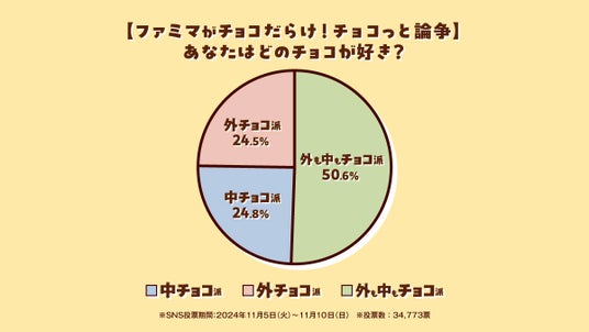 「ファミマがチョコだらけ!」キャンペーンでは、シリーズの特長である、バラエティ豊かな“食感”に着目し、わくわくする「中チョコ派」、一口目から嬉しい「外チョコ派」、最初から最後まで幸せ「外も中もチョコ派」の3つの中から、好きな食感を投票するSNSキャンペーンを11月5日(火)~11月10日(日)まで実施いたしました。