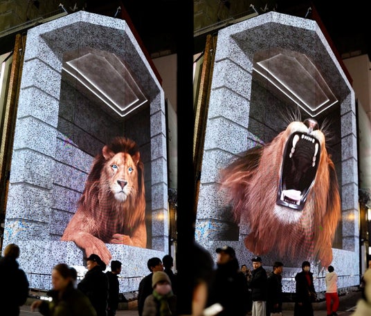 月替わりのPR映像のみならず、3D技術を駆使したライオンの映像も放映中です。ビル内にある台座に鎮座していたライオンが、突然ビルから出て手を伸ばし雄叫びをあげるという3D映像の真骨頂である奥行きを活かした映像となっています。
