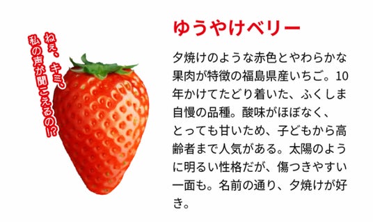 福島県は、3月12日、県民をはじめ多くの皆様に「福島県産オリジナル品種のいちご」を楽しく学び、理解を深めて頂くために、いちごと出会い、対話をしながら選択形式でハッピーエンドを目指すシミュレーションゲーム「いきなりストロベリー」を作成しました。このゲームはブラウザ上で楽しめるゲームとなっており、スマートフォンでもPCでも遊んで頂ける仕様となっております。登場するいちごは、「ゆうやけベリー」「ふくはる香」「ふくあや香」の福島県オリジナル3品種。その特徴が2択のクイズ形式で出題され、すべて正解するとラストのハッピーエンドが見られる仕様となっております。
