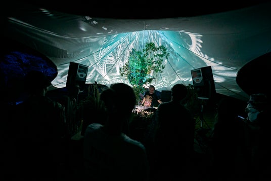 森に囲まれたダンスフロアは柔らかな芝生に覆われ、裸足で大地を踏みしめながら踊ることができる。