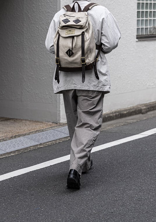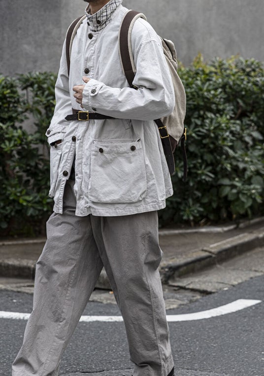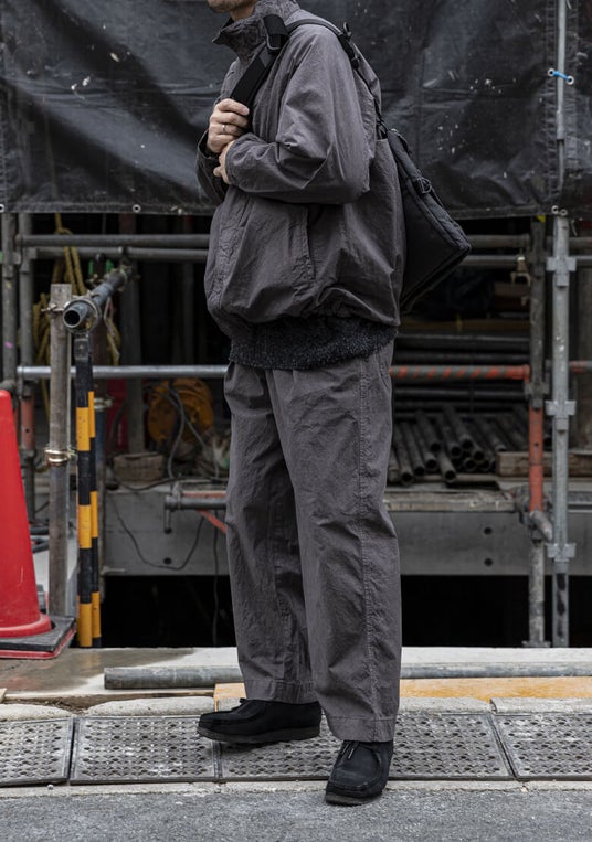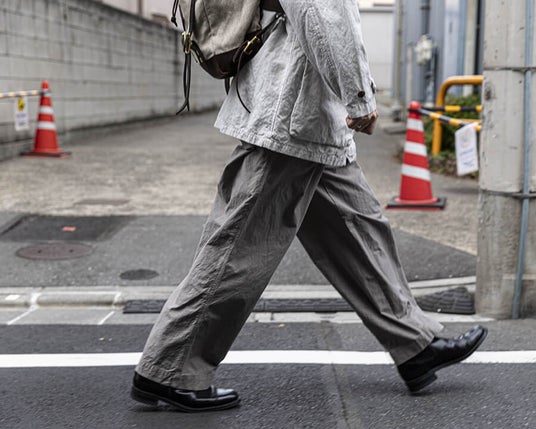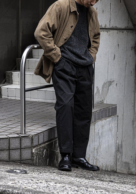 この服の “主役”は何か。それは、生地の質感(=texture)。CONFECTの定番素材・スーピマコットンオックスフォードで作るトラウザーズ。
