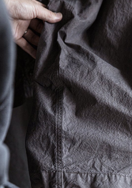 細番手コットンを高密度に織り上げ、生地段階で特殊な洗いをかけることで表面が滑るほどに毛羽が減り、シボのような微細な凹凸が生じます。極端に言えば、この「生地の質感を、着る。= Wearing texture」そんな楽しみ方をご提案するシンプルなウェア達がラインナップされています。