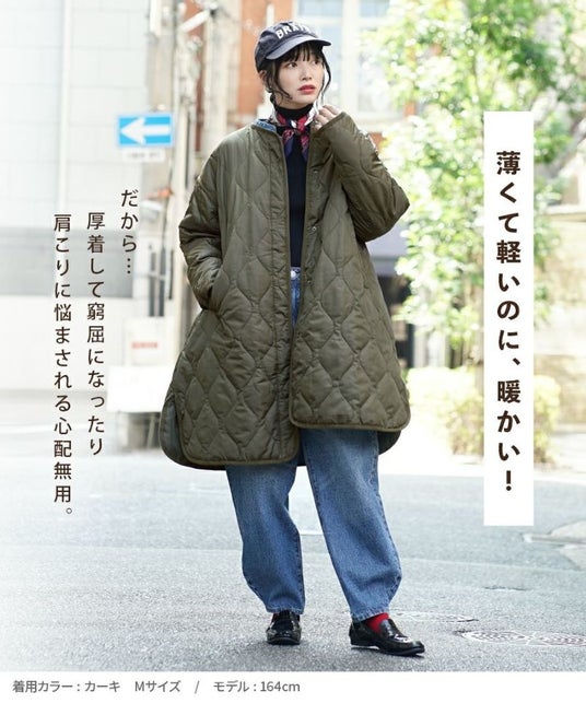 薄くて軽いから肩こりの心配はありません (ロングコート カーキ着用)