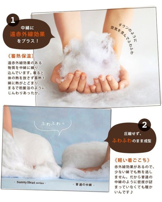 サニーヒートシリーズは、長いシーズンで活躍するマルチなアイテムです。ふんわりと軽い着心地でありながら優れた保温性を備えているため、気温変化の大きい秋から春先まで快適にお使いいただけます。保温効果の高い中綿と遠赤外線効果で厳寒期でも暖かさをキープ。寒さの厳しい冬のお出かけにも頼もしい味方になってくれます。