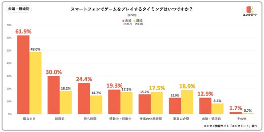 未婚・既婚別で見ると、「暇なとき」や「就寝前」、「待ち時間」と回答した人は未婚者が10%ほど多くなっています。既婚者の場合は、必然的に子どもがいる家庭も多くなると考えられ、育児などで忙しくなりスマートフォンゲームをプレイできるような時間が未婚者に比べて少ないと推察されます。その一方で「家事の合間」と回答した人は既婚者が6%多く、これは家事を専業主婦・主夫が担当している家庭が一定数あることが理由だと考えられます。