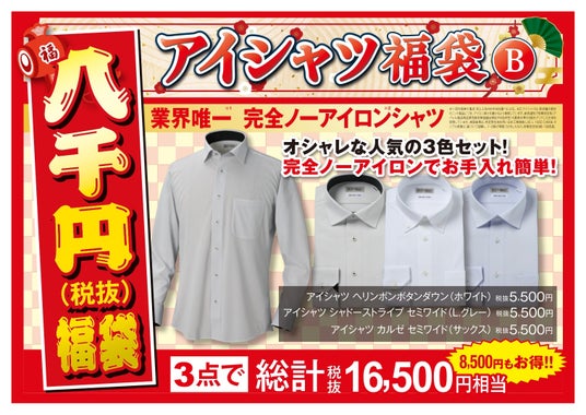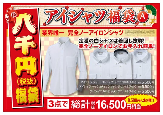 アイシャツ(定価:税込み6,050)円の品が3点セットで税込み8,800円と福袋限定のお買い得価格で販売いたします。Aセットはホワイトが3枚、Bセットはホワイト、ライトグレー、サックスの3色各1枚ずつがセットになっております。※シャツのデザインはお選びいただけません。