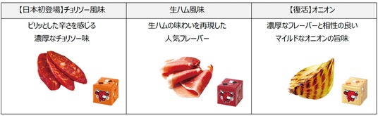 人気の「生ハム風味」、ピリ辛「チョリソー風味」、マイルドな「オニオン」の3フレーバーがちょっとリッチで楽しいおつまみタイムを演出!