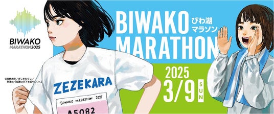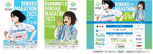 ● 宮島未奈氏著『成瀬は天下を取りにいく』 ランナービジュアルに「成瀬あかり」、ボランティアビジュアルに「島崎みゆき」を採用。 びわ湖マラソン2025のために大人気イラストレーター「ざしきわらし」氏が描き下ろし。 ランナー募集のポスター、パンフには成瀬、ボランティア募集ポスター、パンフには島崎 がデザインされています。大会HPや公式Instagram、Xにも登場します。