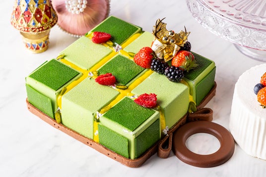 ライム風味のホワイトチョコレートムースの中にはピスタチオのババロア、ピスタチオのビスキュイとピスタチオのキャラメリゼを忍ばせました。ナッティーなピスタチオの風味とラズベリーのゼリーやライムの香りが爽やかな味わいです。色違いのキューブ風アレンジがキュートなグリーンのキャリーバッグをイメージしたクリスマスケーキ。