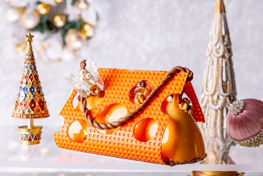 マロンムースの中にはブランディーに漬け込んたキャンディオレンジやコーヒー風味のババロア、マルメロと洋梨のコンフィチュールなどを忍ばせ、しっとりとした胡桃入りのパンドジェンヌが受け止めます。チョコレートで作るまるで革のような繊細な加工とバッグのハンドルが印象的なオレンジ色のミニボストンバッグをイメージしたクリスマスケーキ。