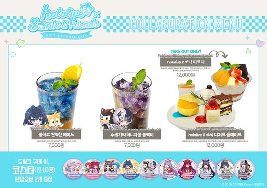 本コラボカフェでは、「ソニック・ザ・ヘッジホッグ」のショートアニメ「ソニック&フレンズ」の登場キャラクターである「ソニック」「テイルス」「ナックルズ」「エミー」「シャドウ」と、「ホロライブEnglish」所属の5名(「一伊那尓栖」、「IRyS」、「オーロ・クロニー」「シオリ・ノヴェラ」、「古石ビジュー」)それぞれの組み合わせをイメージしたコラボメニューが販売されます。ほかにも、描き下ろしイラストを使用したアニメイトカフェ限定のグッズも販売されています。