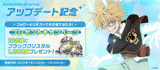 アップデートを記念して、公式X(旧Twitter)ではフォロー&リポストでブラッククリスタル1,200個が当たるキャンペーンを開催中です。