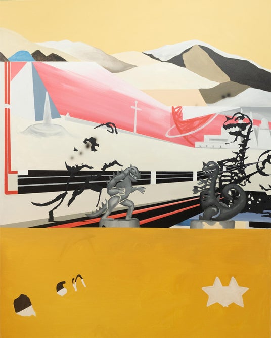 都市の記号である文字、建築、景色などをモチーフに用い、複数の時間と視点を持った流動的な絵画空間を構築する。
