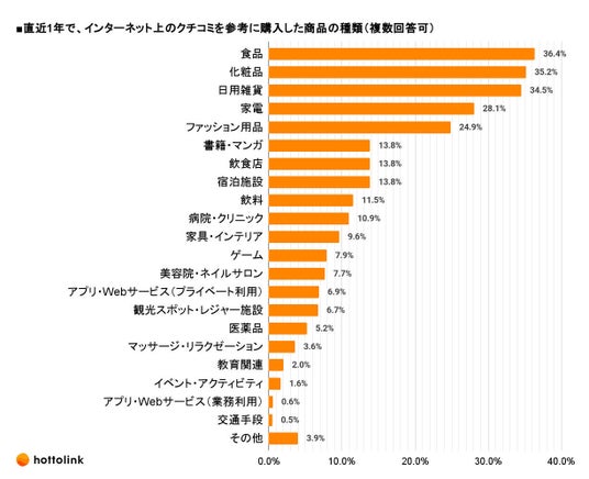 (1)で「ある」と答えたユーザーに、直近1年で、インターネット上のクチコミを参考に購入した商品やサービスを聞いたところ、「食品」が36.4%、「化粧品(スキンケア、メイクアップ)」が35.2%、「日用雑貨」が34.5%で上位を占めました。