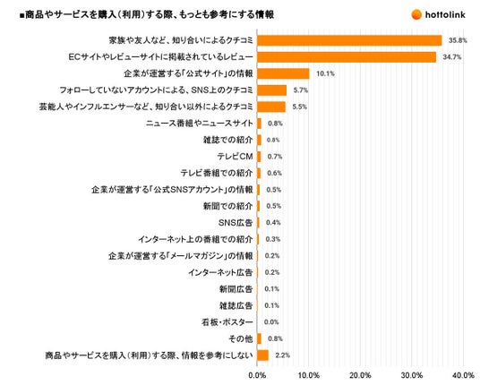 商品やサービスを購入(利用)する際、参考にする情報を聞いたところ、「家族や友人など、知り合いによるクチコミ」が35.8%、「ECサイトやレビューサイトに掲載されているレビュー」が34.7%で上位を占めました。